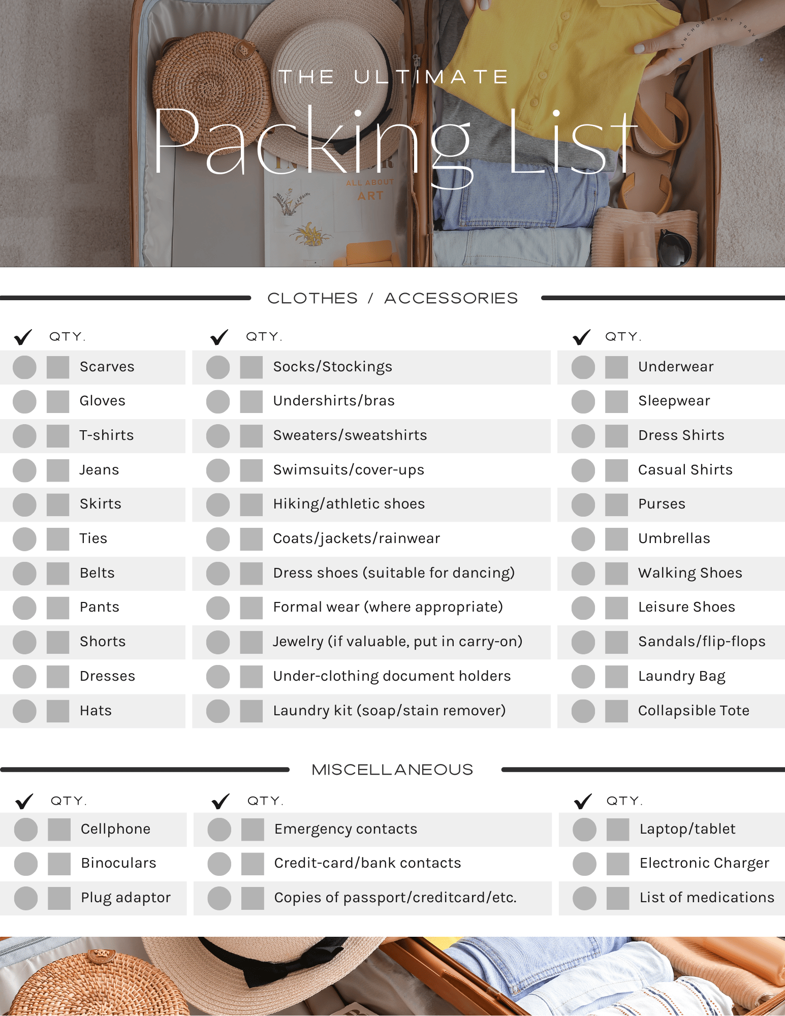 Sign up below to download our "Ultimate Packing List" and never worry again you are leaving something you need at home.